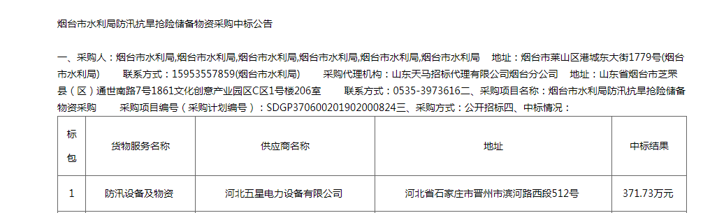 熱烈祝賀河北五星煙臺市水利局防汛抗旱搶險儲備物資采購一舉中標!